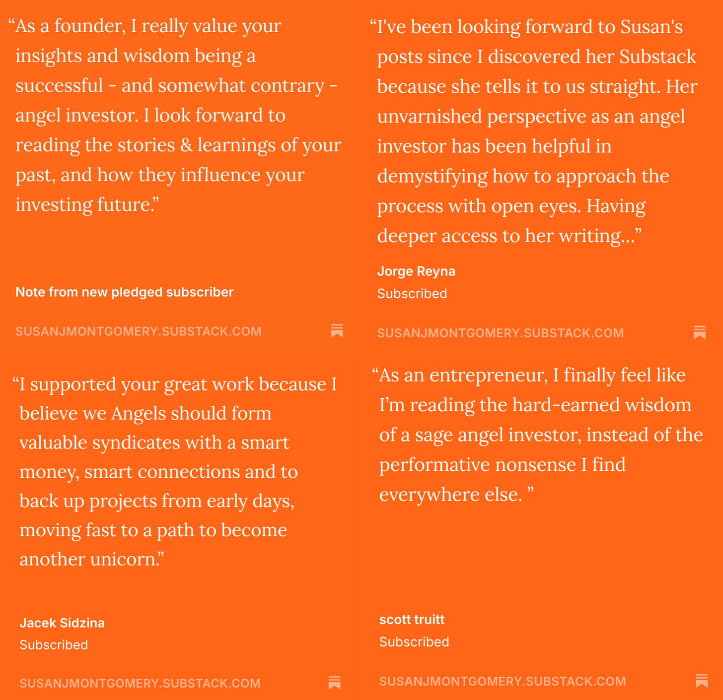 Six ‘Angels & Unicorns’ ebooks sent to you before they are published ever two months covering how to build or spot seed-stage winners.